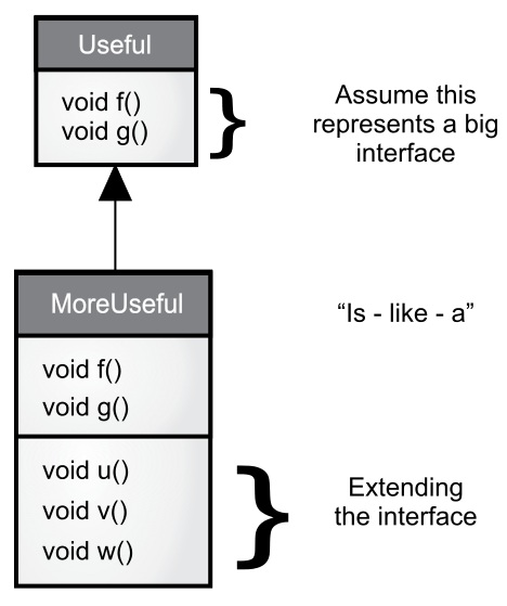 按这种方式思考,似乎只有纯粹的“is - a”关系才是唯一明智的做法,其他任何设计只会导致混乱且注定失败。这其实也是个陷阱。一旦按这种方式开始思考,就会转而发现继承扩展接口(遗憾的是,extends 关键字似乎怂恿我们这么做)才是解决特定问题的完美方案。这可以称为“is - like - a” 关系,因为派生类就像是基类——它有着相同的基本接口,但还具有需要额外方法实现的其他特性: